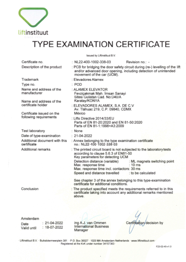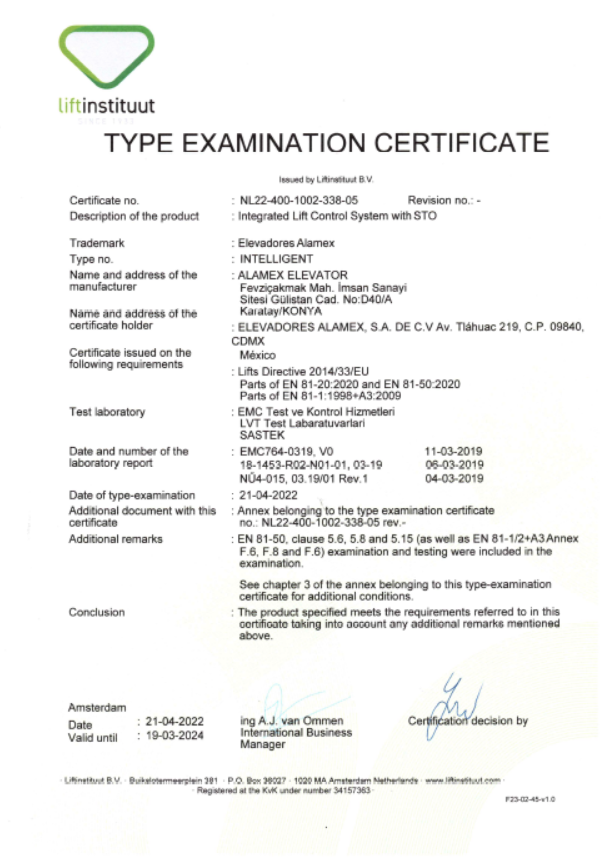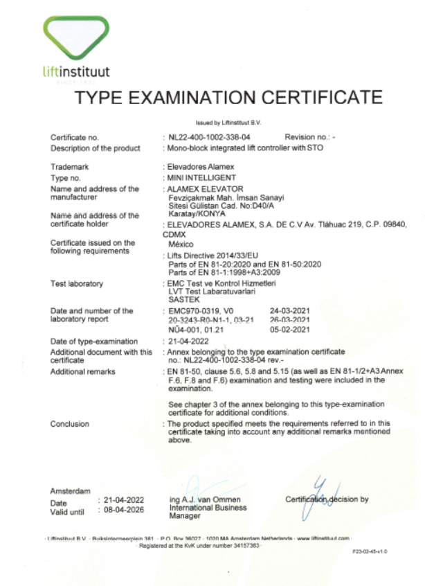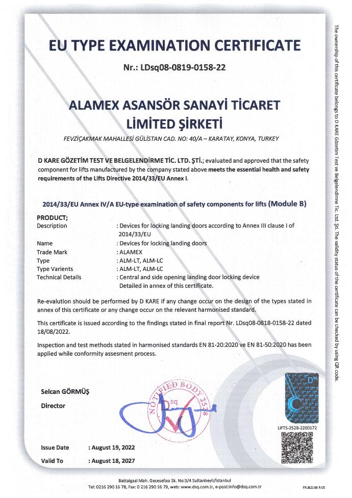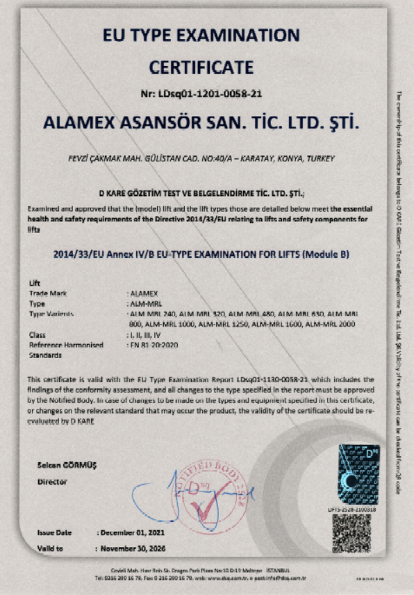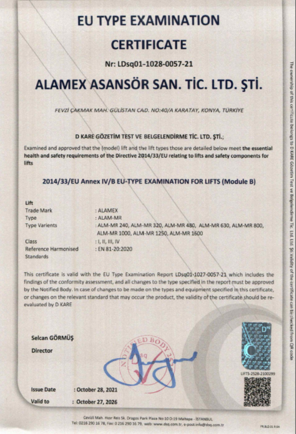 (ALAMEX MR)  2014/33/EU Annex IV/B EU-TYPE EXAMINATION FOR LIFTS (MODULE B)