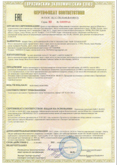 Our elevator solution has achieved the EAC certificate, confirming its compliance with the safety and quality standards necessary for installation and operation within the Eurasian Customs Union.
