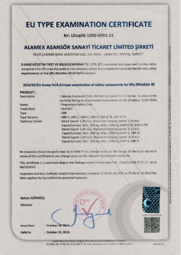 (SAFETY GEAR) 2014/33/EU Annex IV/A EU-type examination of safety components for lifts (Module B)