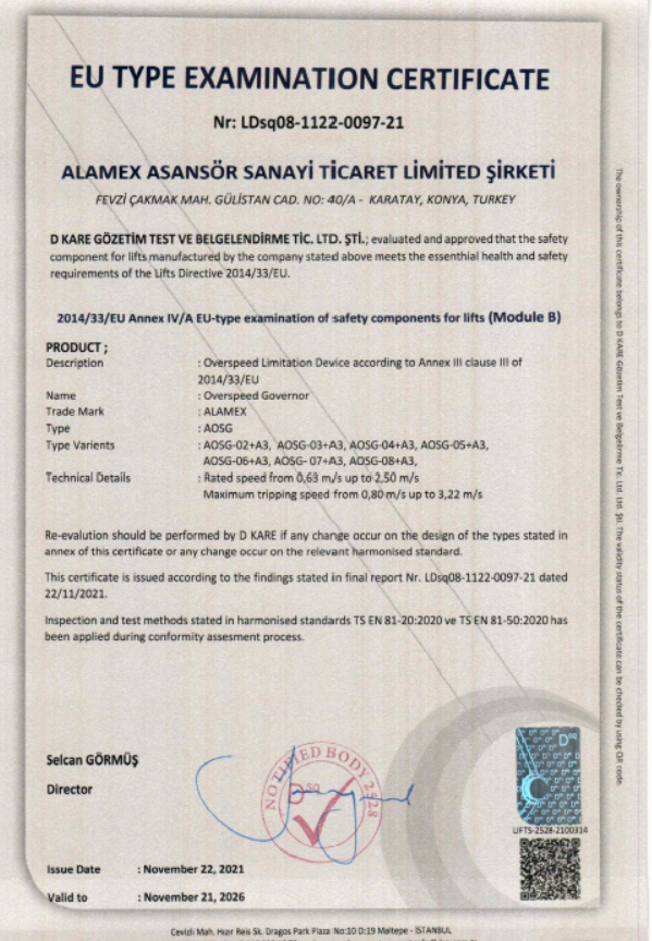 (OVERSPEED GOVERNOR) 2014/33/EU Annex IV/A EU-type examination of safety components for lifts (Module B)