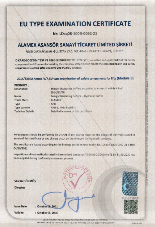 (HYDRAULIC BUFFER) 2014/33/EU Annex IV/A EU-type examination of safety components for lifts (Module B)