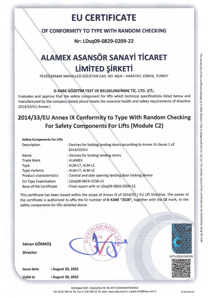 (DEVICES FOR LOOKING LANDING DOORS) 2014/33/EU Annex IX Conformity to Type With Random Checking For Safety Components For Lifts (Module C2)